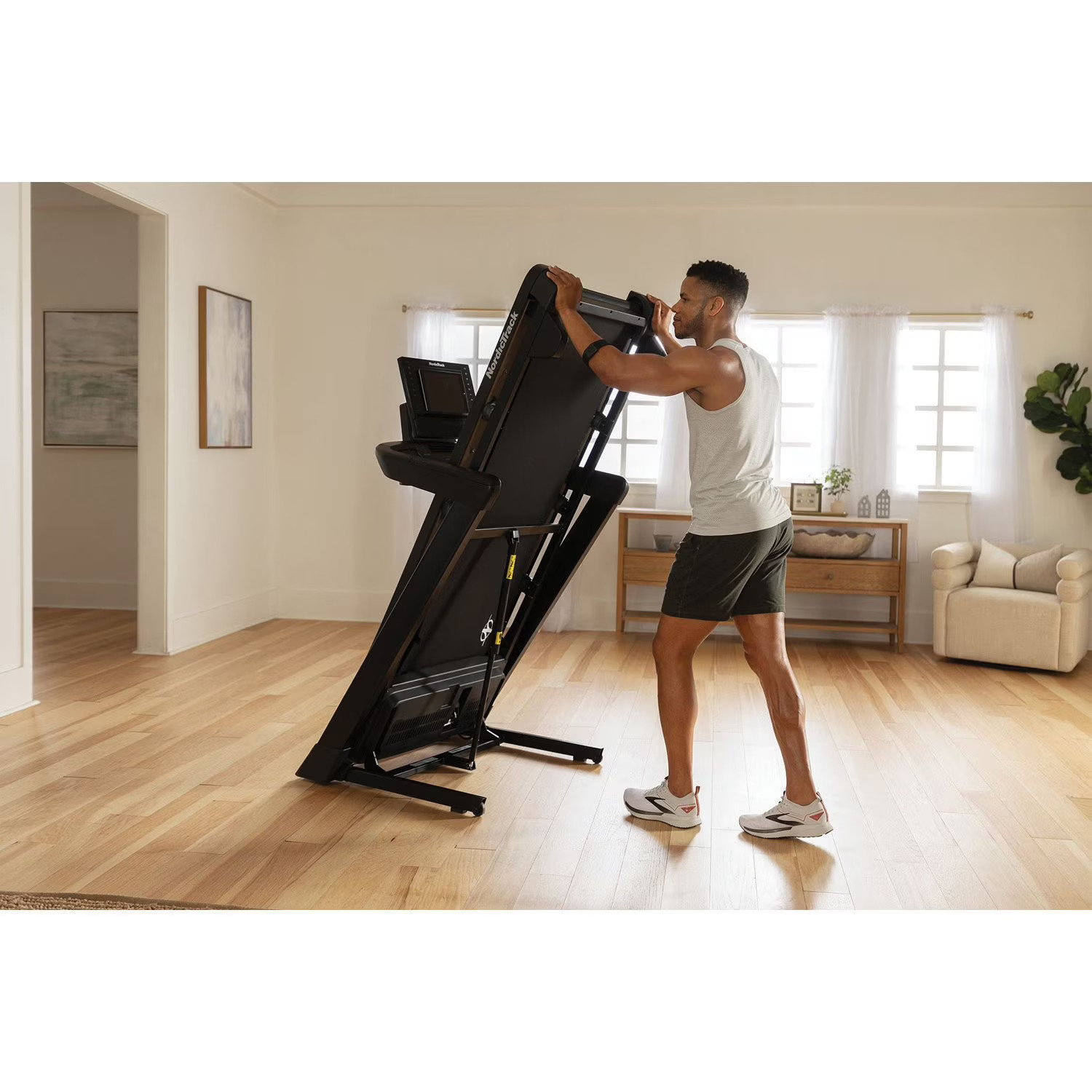 NordicTrack T Series 8 turi SpaceSaver™ sulankstymo sistemą, kuri leidžia treniruoklį patogiai pakelti ir laikyti vertikalioje padėtyje.